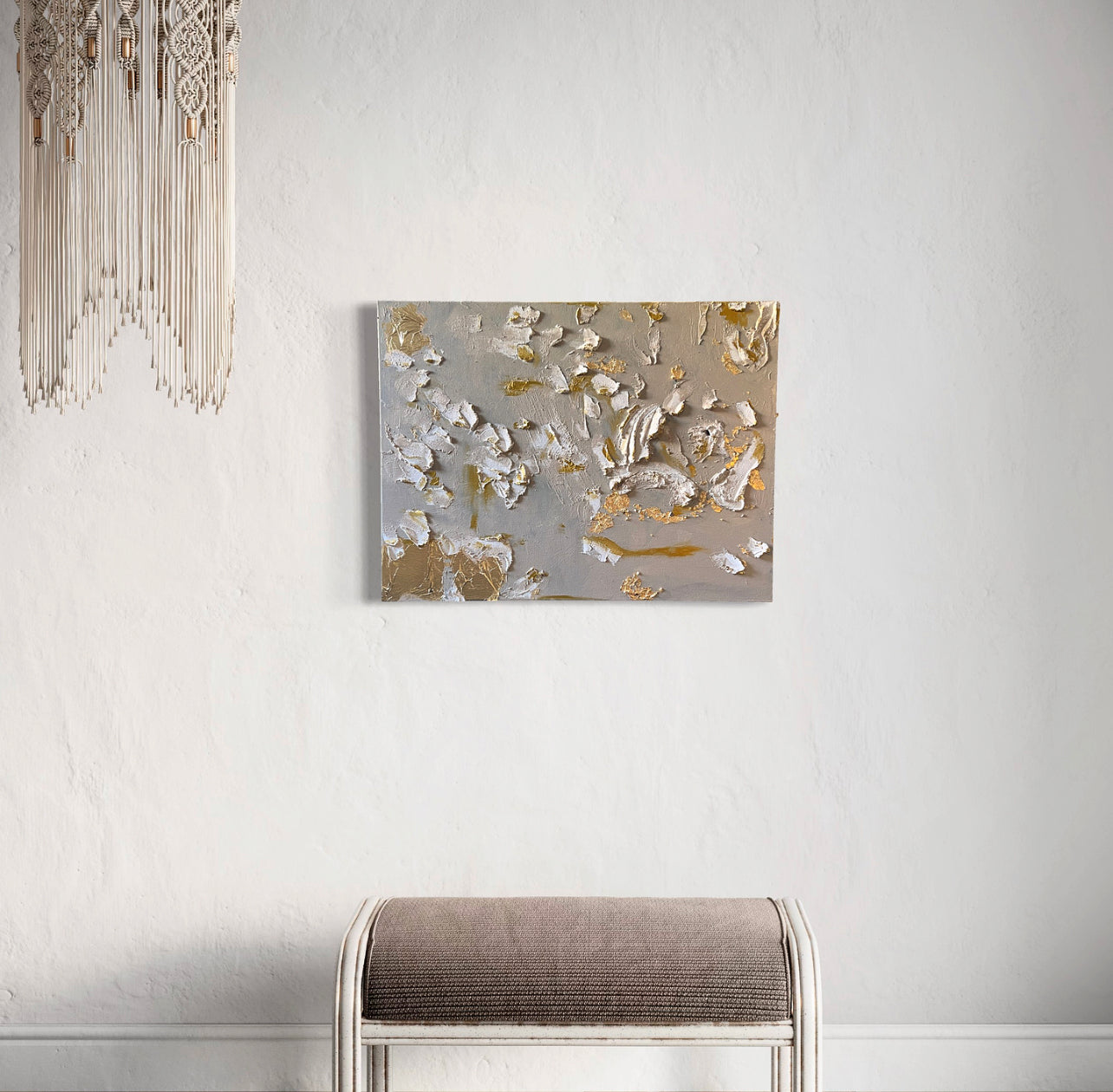 L’or danse en touches subtiles, rappel d’un soleil caché derrière un voile nacré, où chaque reflet est une promesse de douceur.