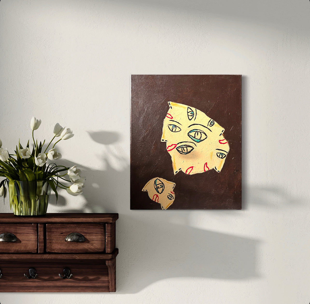 Les yeux, multiples et asymétriques, scrutent sous différents angles, comme s’ils cherchaient à comprendre leur propre existence. Certaines paupières s’ouvrent avec stupeur, d’autres se ferment sur des pensées inachevées. Des lèvres courbes, égarées dans cette composition éclatée, semblent prêtes à parler mais restent figées dans un silence cubiste.