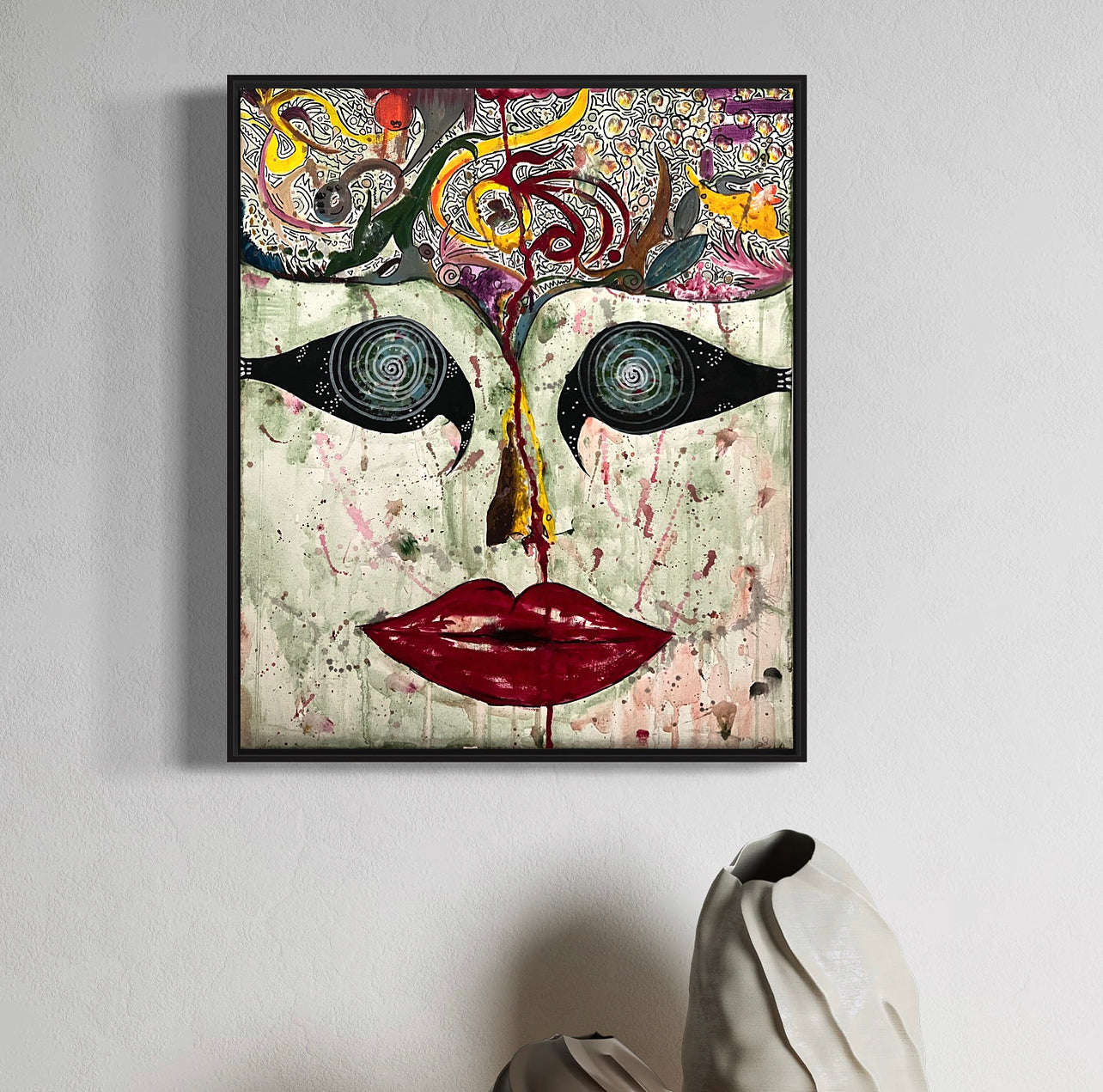 Les lèvres, rouges comme l’aube, s’ouvrent sur un murmure ancien, un cri étouffé par la beauté, un poème suspendu dans les pensées.