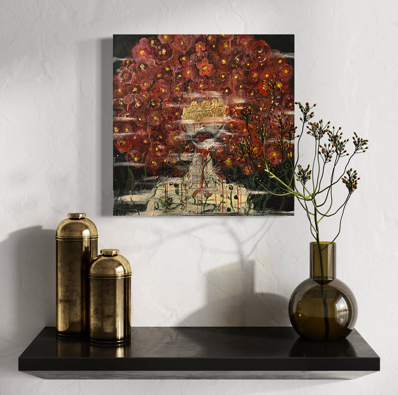 Cette femme émergée d’un océan de fleurs ardentes, comme un esprit en fusion avec la nature, une présence à la fois puissante et évanescente. Son visage, à peine discernable, se fond dans l’arrière-plan, comme si elle était une apparition, une mémoire en train de se dissoudre ou un rêve prenant forme.