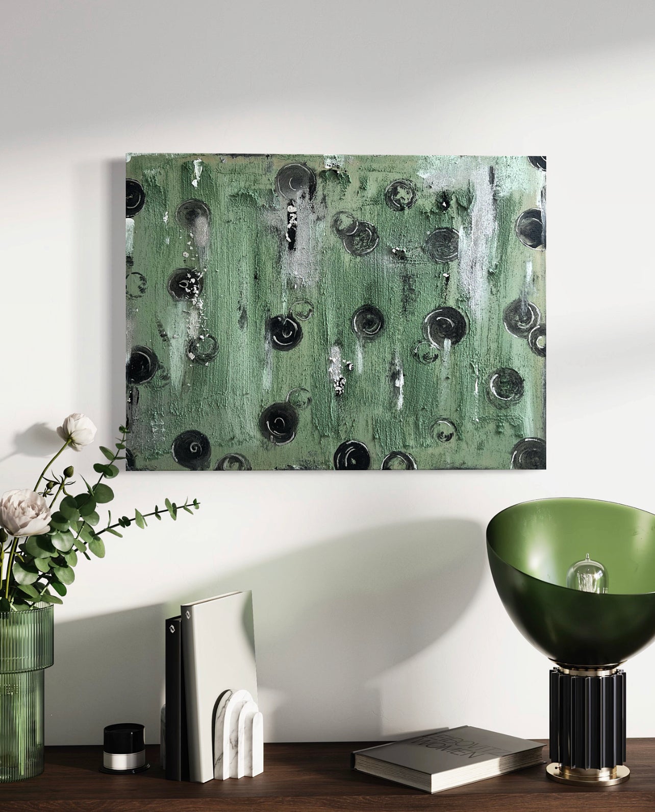 Un rude souffle vert habille la toile, comme un écho de nature endormie, où l’ombre et la lumière s’entrelacent dans un murmure de mousses et de vents.