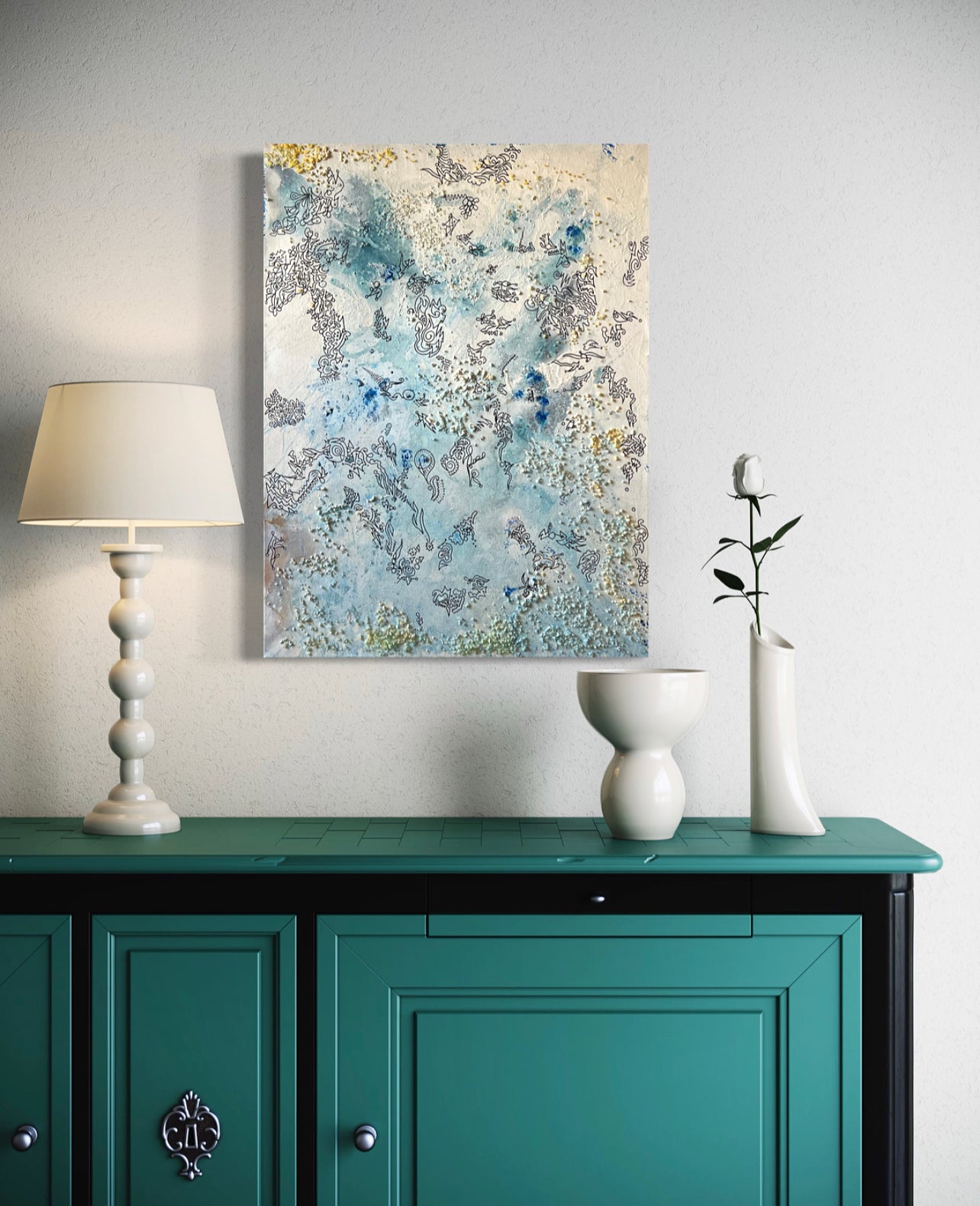 Le sel s’est fait tempête, soufflé par les vents du mystère. Il danse en éclats de lumière, caressant le bleu des abysses, où le ciel épouse la mer.
