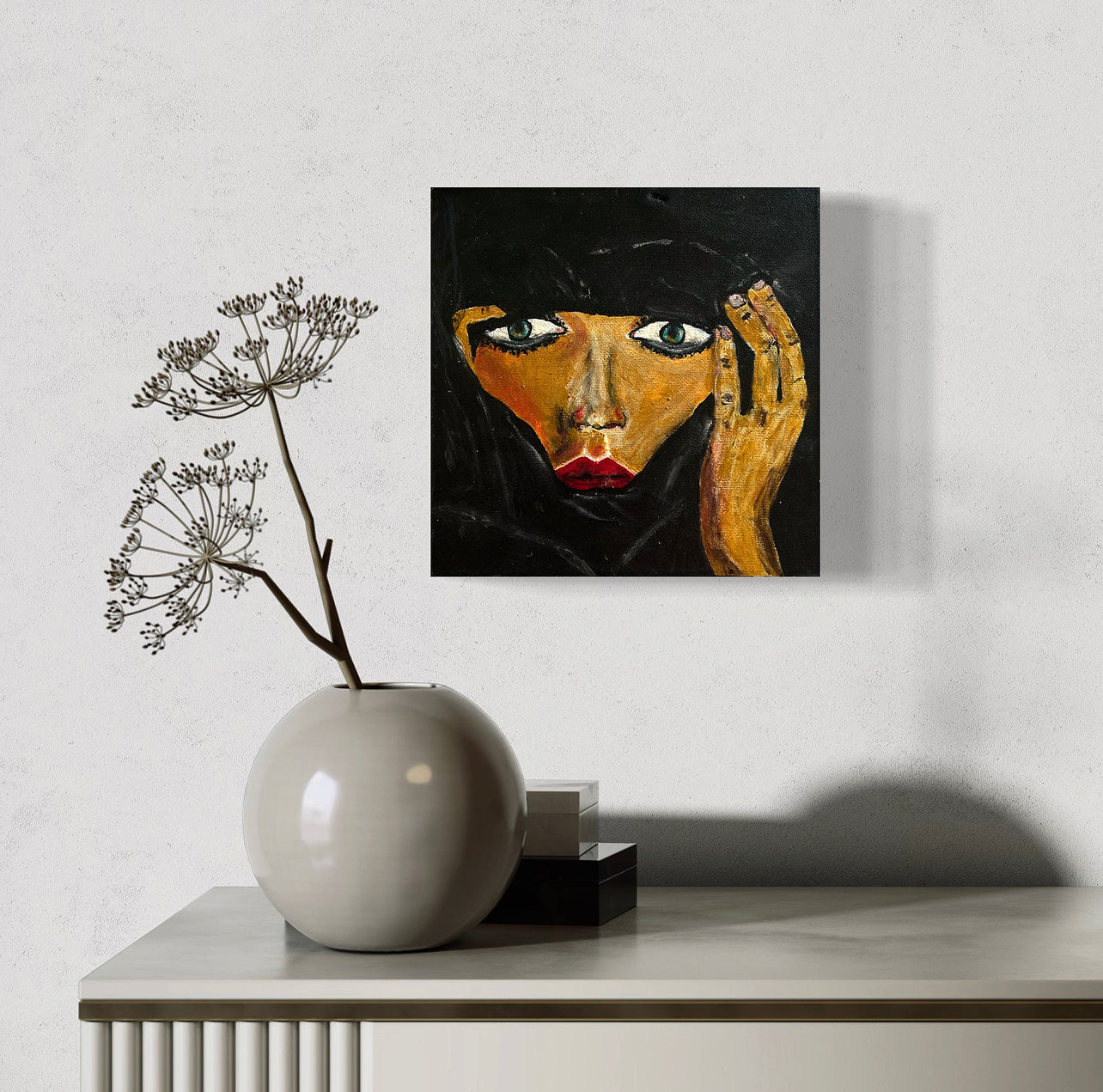 Ses lèvres, rouges comme un secret, tremblent d’un murmure inachevé, tandis qu’une main effleure, l’écho d’une pensée égarée.
