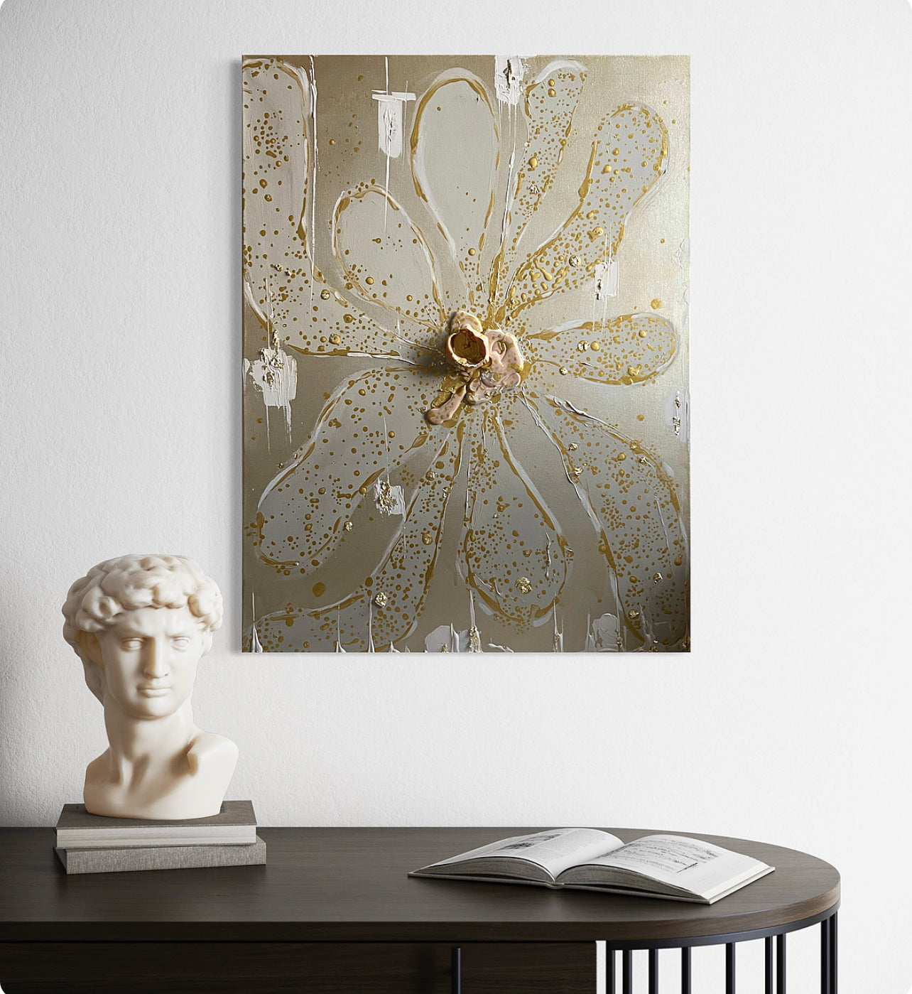 Sous le regard du temps, une fleur d’or s’épanouit, ses pétales déployées comme les rayons d’un soleil ancien.