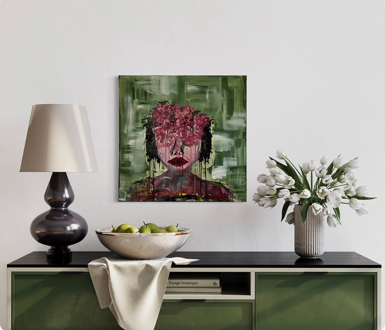 Là où devraient briller les yeux, une floraison s’élève, un jardin foisonnant de roses éclatantes, mêlées aux ombres d’une chevelure qui s’efface dans le néant. Des pétales ruissellent, comme des pensées trop lourdes qui s’échappent en douceur, comme des souvenirs qui s’effondrent dans le vent.Le fond vert, brut et texturé, encadre cette apparition comme un écrin sauvage, un écho à la nature qui reprend toujours ses droits. Le rouge des lèvres, profond et vibrant, est une lueur de vie, une empreinte de passion qui défie le temps.