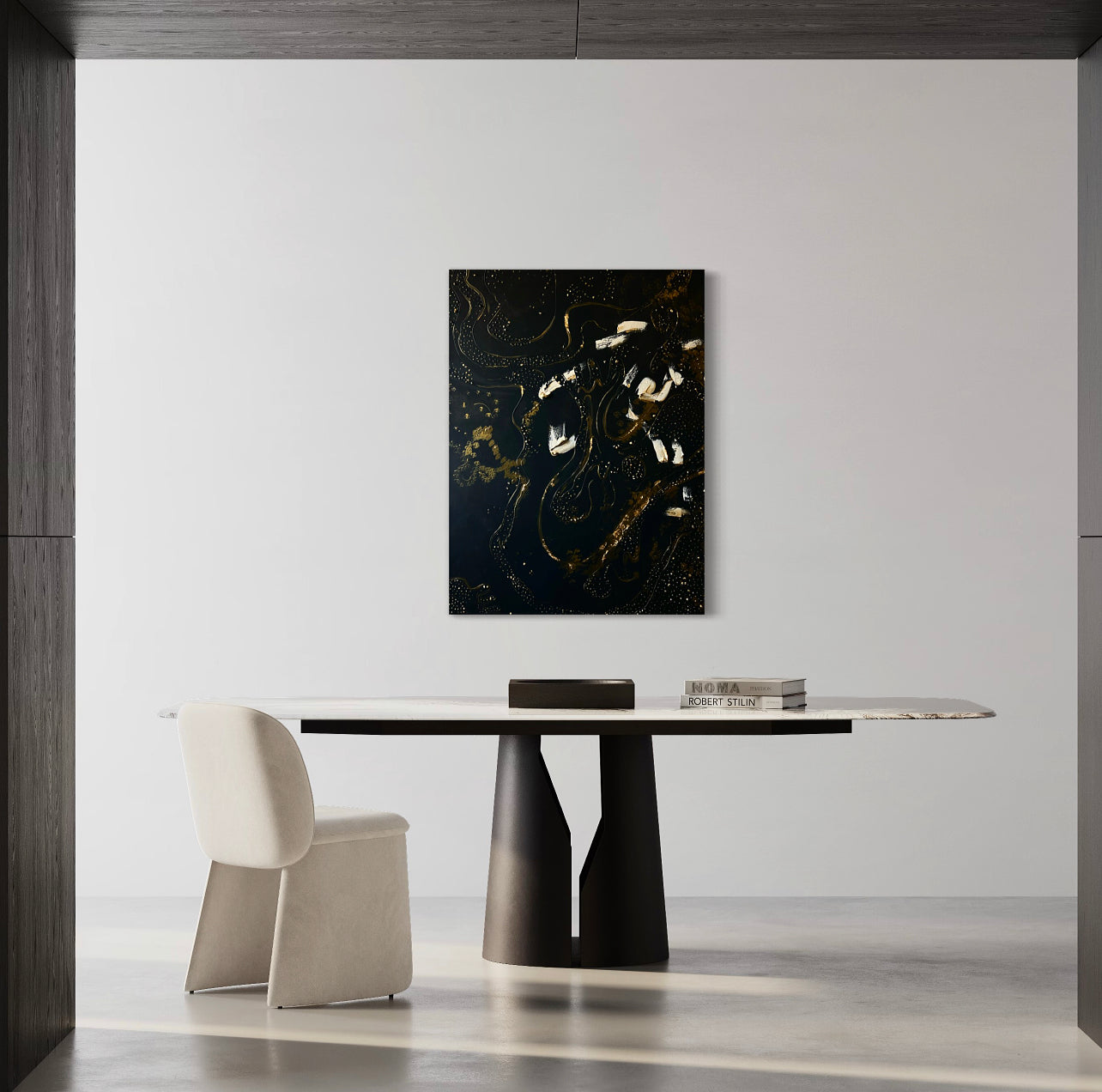 Dans l’écrin nocturne d’un ciel ébène, des étoiles d’or chuchotent, des fragments épars scintillent à peine, comme des éclats de mémoire éparpillés, comme un fragment d’âme. Elles dansent en silence, constellations tracées, des chemins célestes, par l’invisible enlacés. Des rivières d’or serpentent en silence, tracent des chemins d’ombre et d’errance. Vestiges d’un feu qui s’est consumé, des cendres blanches se sont dispersées.