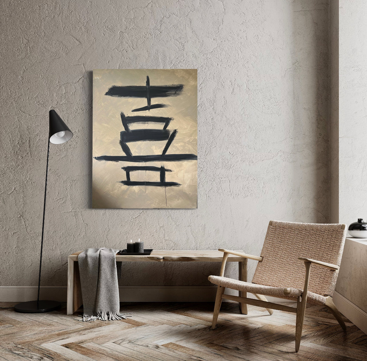 C’est le “福”, le bonheur, écrit en traits bruts, comme tracé d’un souffle, d’un élan, où chaque ligne soutient l’autre, où l’équilibre danse avec le silence. Le noir profond s’impose sur l’ocre délicat, comme l’encre sur le papier ancien, comme un murmure ancestral qui traverse les âges pour murmurer encore.