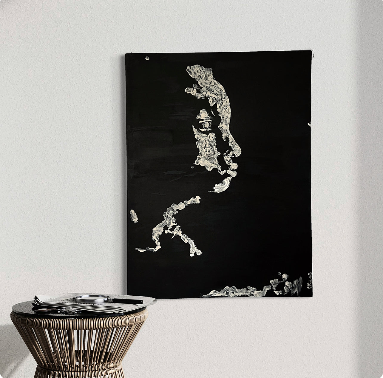 Dans l’obscurité profonde de la toile, une silhouette humaine émerge, fragile et éthérée. Comme sculptée par la lumière, elle se dessine en volutes blanches, éclats d’écume sur une mer d’encre. Son profil, à peine esquissé, semble suspendu entre l’être et le néant, une apparition fugace capturée dans le silence.