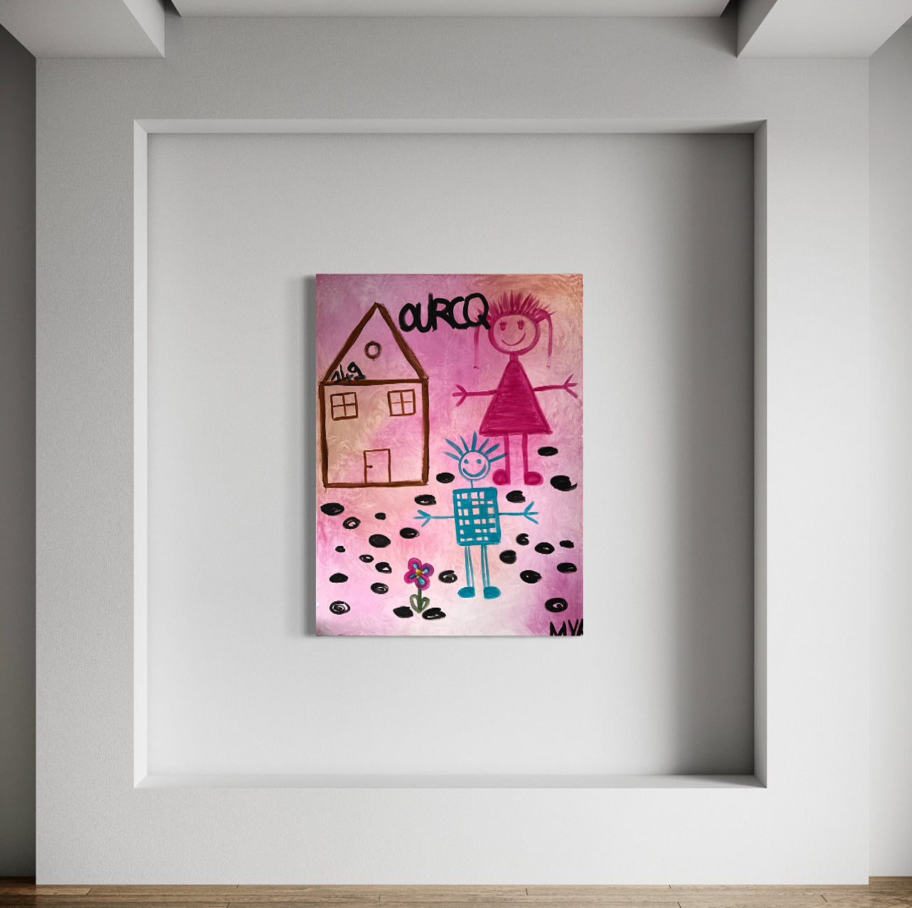 Le choix des éléments – une maison, deux personnages, un sol ponctué de motifs, une fleur – évoque un besoin fondamental de repères, de stabilité et d’affection. La figure féminine en rose, plus grande, symbolise une figure protectrice, sa sœur, une personne chère, tandis que le personnage bleu, plus petit et stylisé, incarne l’enfant, son frère, l’artiste elle-même est la fleur.
