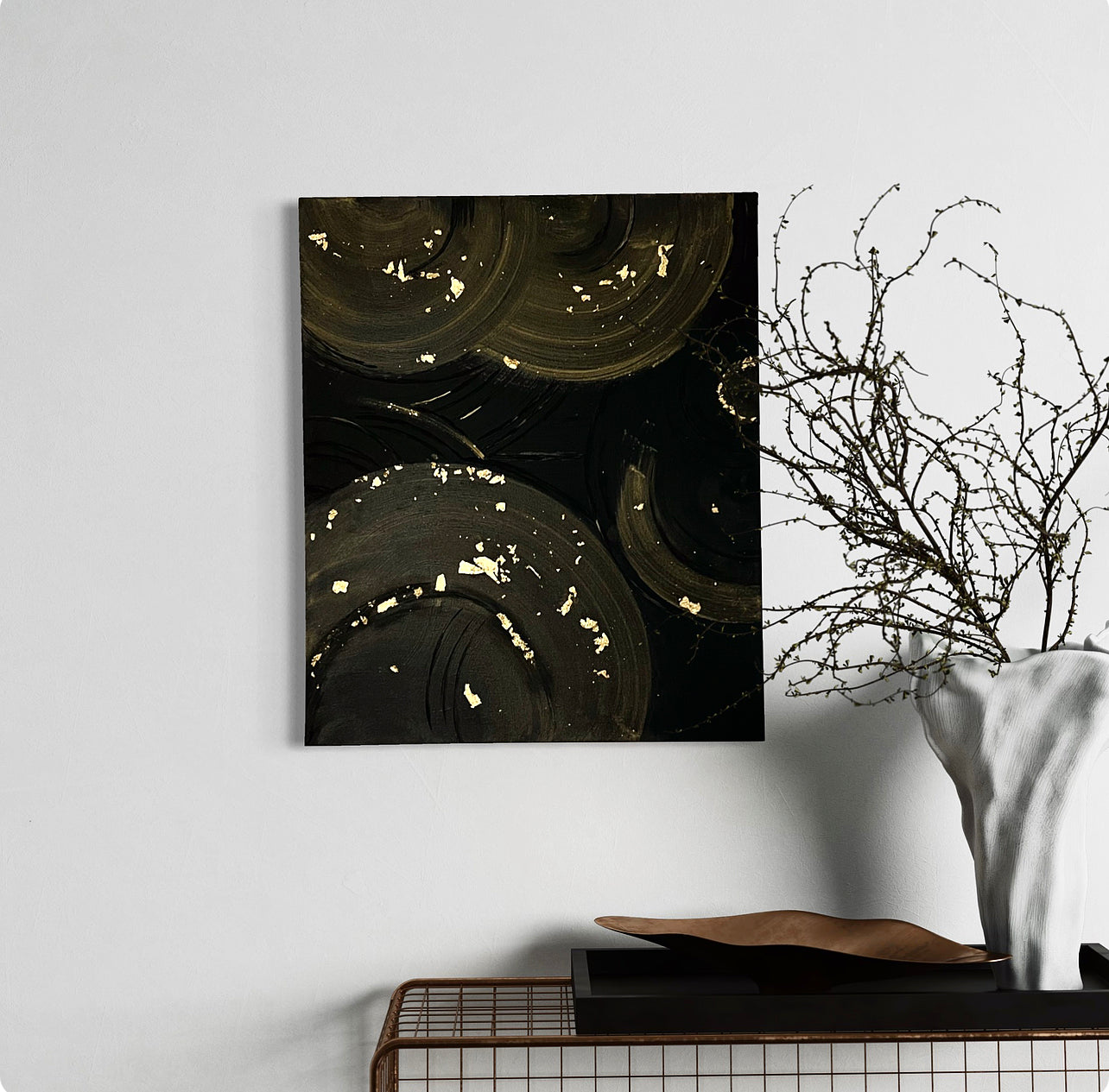Cette toile évoque une nuit profonde, traversée par des tourbillons de mystère et de lumière. Des spirales sombres, tracées avec force et fluidité, semblent danser sur un fond abyssal, comme des vagues silencieuses emportées par un vent invisible. Çà et là, des éclats d’or s’accrochent à la surface, tels des fragments d’étoiles dispersés dans l’obscurité, rappelant une pluie d’astres perdus ou les reflets du soleil sur une mer d’ébène.